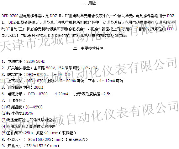 DFD-0700型電動操作器,是DDZ-Ⅱ、Ⅲ型電動單元組合儀表中的一個輔助單元。電動操作器適用于DDZ-Ⅱ、DDZ-Ⅲ型變送單元,調(diào)節(jié)單元與執(zhí)行機構(gòu)所組成的各種自動調(diào)節(jié)系統(tǒng)。